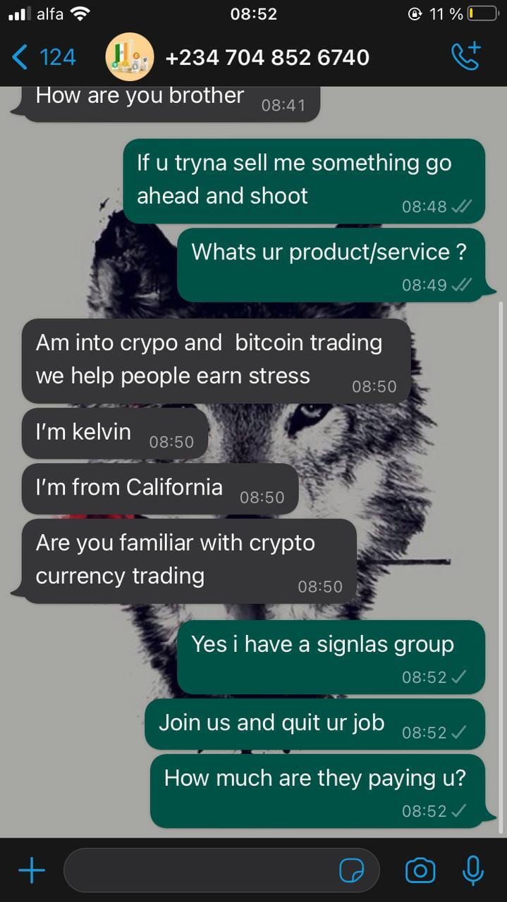 “Hey i saw ur number in a trading group and noticed that u know what u’re doing , do u mind helping me out with which platform to chose ?”